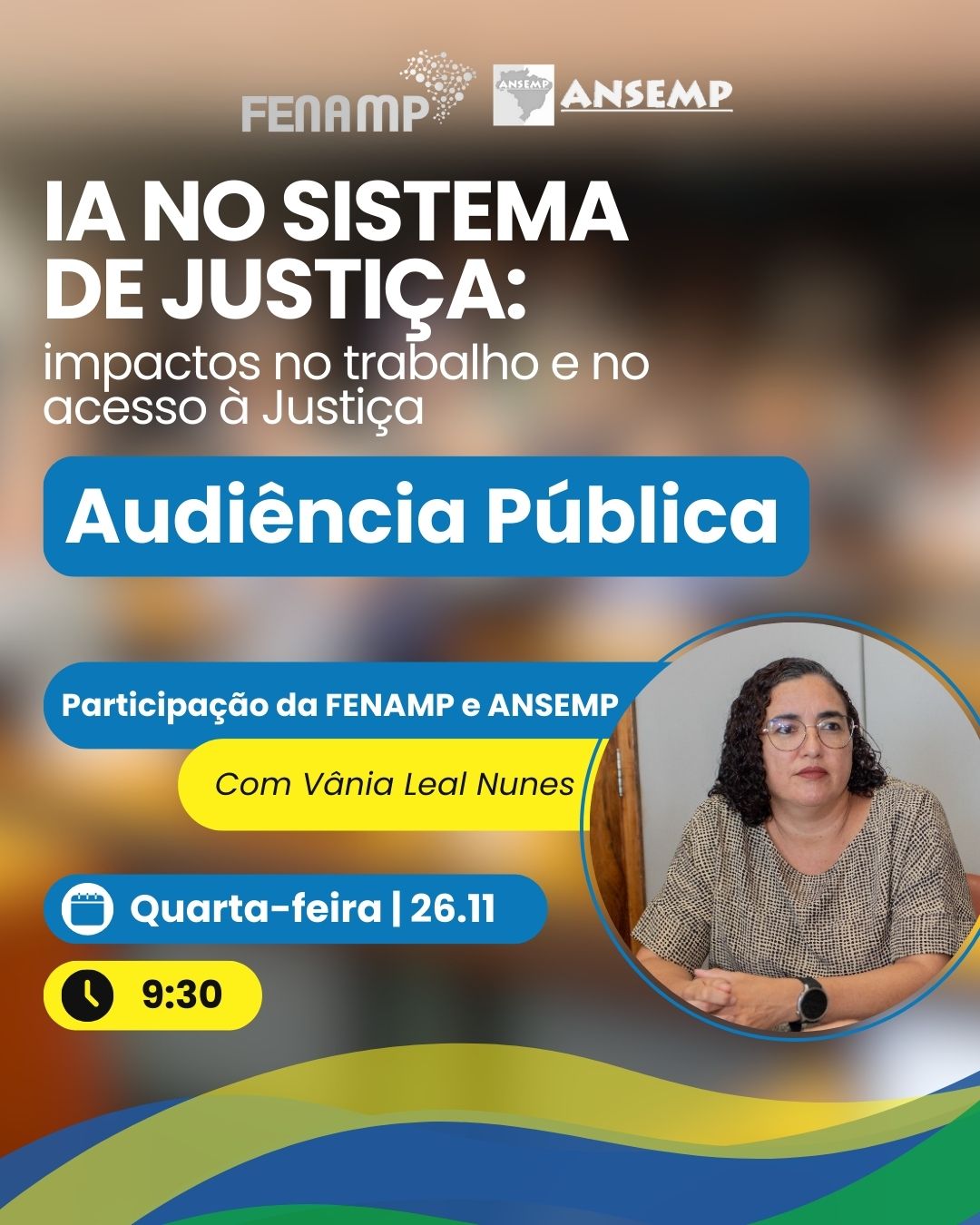 A Presidenta da ANSEMP e Coordenadora Executiva da FENAMP, Vânia Leal Nunes, participará nesta quarta-feira (26), da audiência pública promovida pela Câmara dos Deputados sobre “IA no sistema de justiça: impactos no trabalho e no acesso à Justiça”, com início previsto para às 9h30.