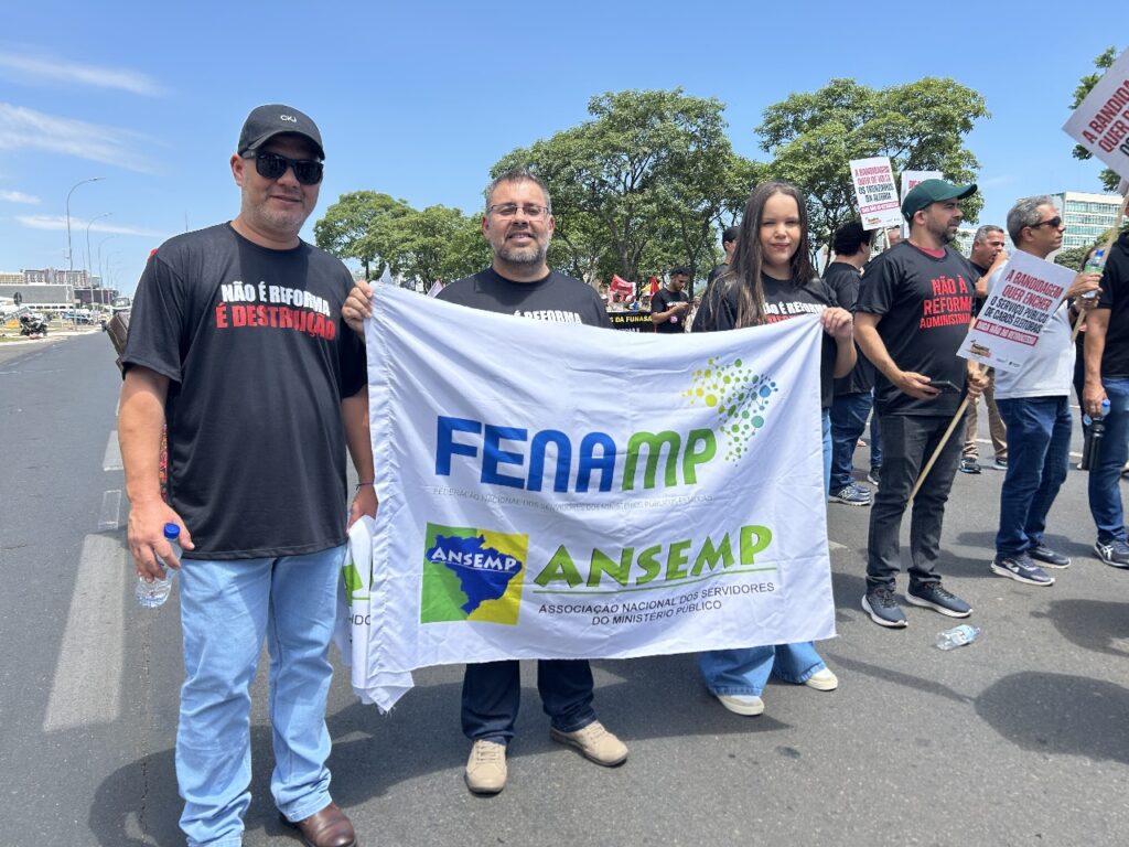 FENAMP, ANSEMP e dirigentes das entidades de base dos servidores dos Ministérios Públicos estaduais participaram, nesta quarta-feira (29), da Marcha Nacional contra a Reforma Administrativa, em Brasília. O ato reuniu mais de 20 mil servidores públicos de todo o país, que seguiram até o Congresso Nacional para protestar contra a PEC 38/2025, em tramitação na Câmara dos Deputados, que representa um grave ataque aos direitos do funcionalismo e aos serviços públicos.